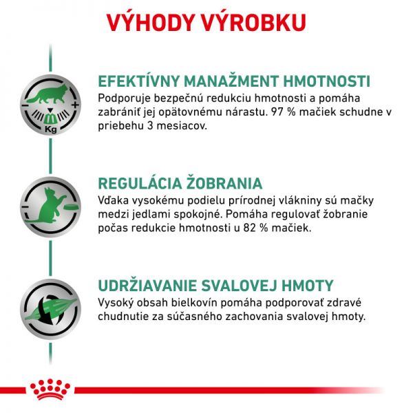Speciální veterinární dieta pro dospělé kočky ke snížení hmotnosti. Nadbytečný příjem potravy a málo pohybu vede u domácích koček k problémům s hmotností. Jedinečně vybalancovaná veterinární dieta s nízkou energetickou hodnotou napomůže snížit nežádoucí nadváhu či obezitu a udržet excelentní kondici kočky. Dieta je vhodná i pro obézní kočky s cukrovkou 2. typu.