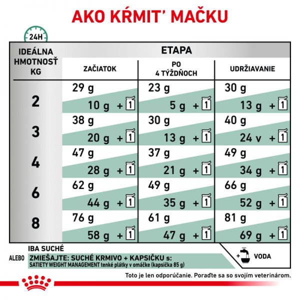 Pokud si objednáte veterinární granule nebo konzervy, potvrzujete tím, že vaše kočka byla vyšetřena veterinárním lékařem a že veterinární lékař na základě diagnózy doporučil použití vámi vybraného krmiva. Nezapomeňte konzultovat stav své kočky a doporučené krmivo s veterinárním lékařem alespoň jednou za 6 měsíců. Pokud se stav vaší kočky během užívání krmiva změní, vyhledejte pomoc veterinárního lékaře.