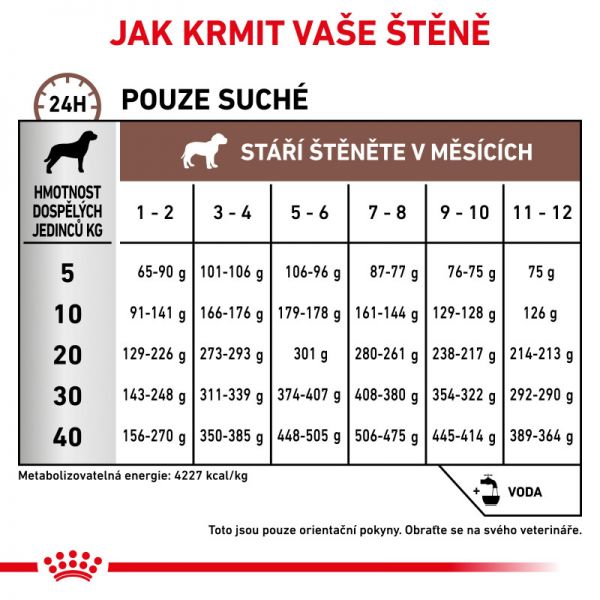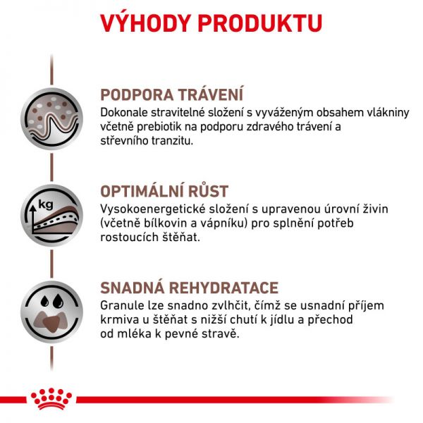 Štěňata trpící zažívacími potížemi mohou být velmi slabá a mohou mít sníženou chuť k jídlu a/ nebo být úzkostlivá. Granule (velikost, textura a tvar) jsou navrženy tak, aby mohly být snadno rehydratovány, což usnadňuje příjem potravy štěňat.